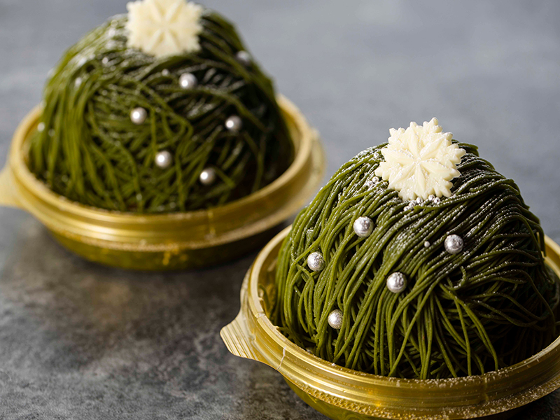 特製モンブランクリームに八女抹茶をブレンドした人気の極細モンブランをクリスマスシーズンだけのツリーに見立てた期間限定メニュー。