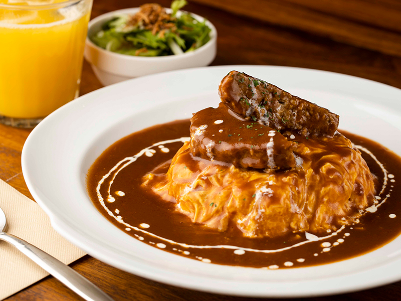 大人のデミグラス登場!今回の新メニューのために作られた新しいデミグラスソースで時間をかけて煮込んだハンバーグをオムライスにオン!ソースがしっかりしみ込んだハンバーグは肉汁たっぷりでふっくらジューシー。