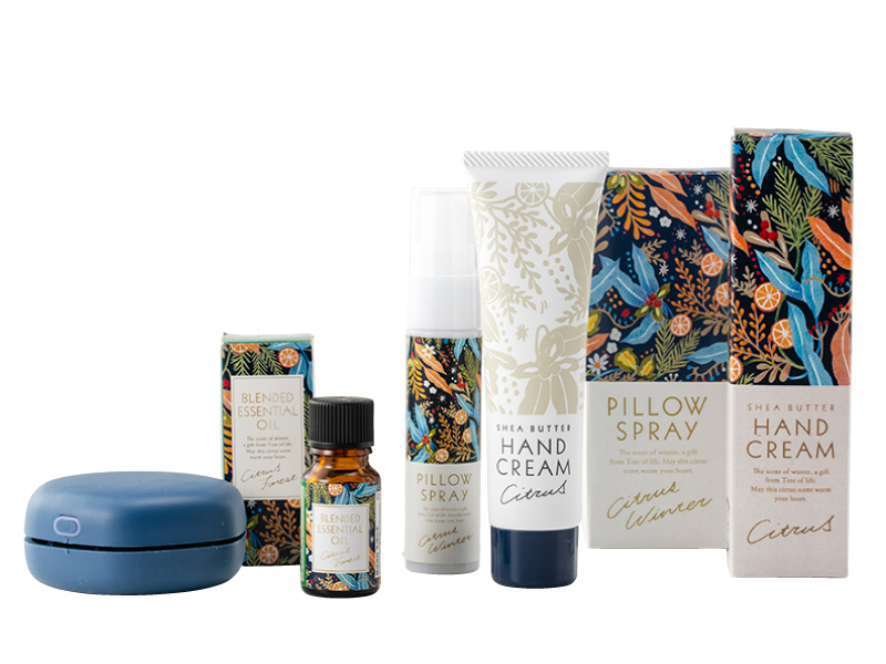 柑橘と森林の香りが冬のリラックスタイムに彩りをプラスしてくれるギフトセット。アロマを使ったナチュラルライフスターターキットとしてもおすすめ。