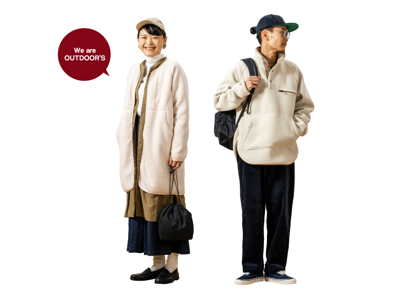レディースは「スノーピーク」の別注ボアフリースコートを中心に、カーキのシャツワンピースをレイヤード。メンズ・レディース異なるブランドのアイテムでありながら、ホワイト・カーキ・ネイビーの3色をキーカラーに組み合わせる事で、統一感が感じられるお酒落上級者の技ありコーデ。