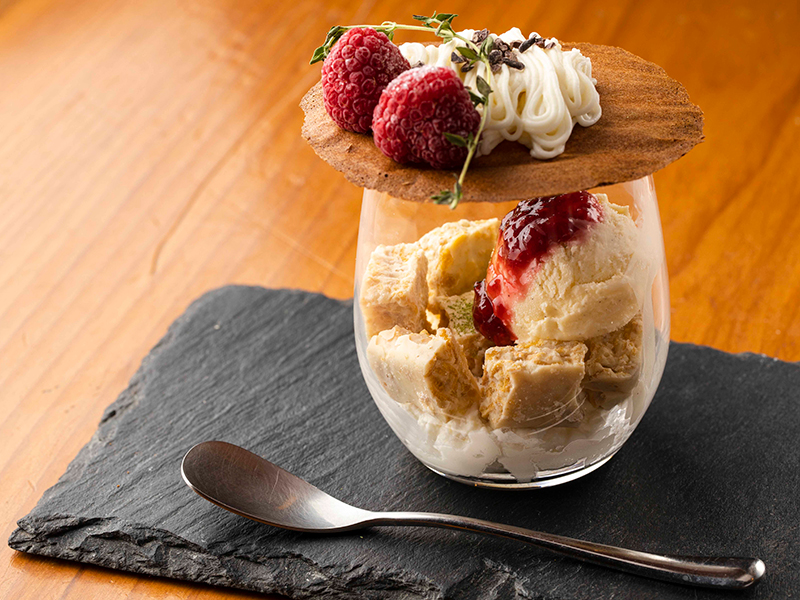 甘酸っぱいラズベリーとレモンムース、ホワイトチョコクランチ、バニラアイス、白あんクリームなどを組み合わせて、雪をイメージしたパフェです。