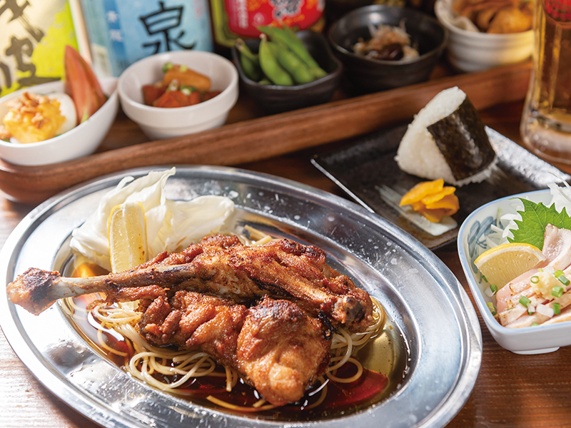 特製スパイスに数日漬け込んだ骨付鳥を、オーブンを使わずに1本1本丹念に焼き上げるこだわりが自慢の骨付鳥専門店。自家製の鶏油と醤油ダレが味の決め手となる骨付鳥は、スパイシーさの中に他では味わえない甘みと旨味をギュッと凝縮。半個室風のテーブル席、掘りごたつの座敷など、隣席を気にせずにゆったりと過ごせる空間で心行くまで堪能しよう。