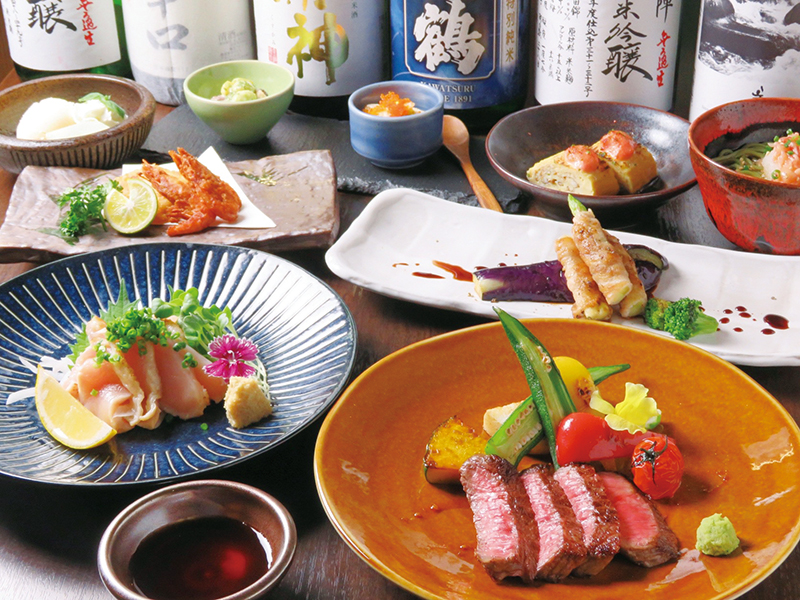 毎朝店主が目利きして仕入れる旬の魚介を用いた和食を中心に、多彩な料理を楽しめる創作居酒屋。カウンターのネタケースには刺身用の魚がずらりと並び、素材の良さはもちろん、料理人の丁寧な仕事が食欲をそそる「刺身盛り合わせ」を目当てに訪れるお客様も多いのだとか。全9品の「おまかせコース」は3,200円、4,200円の2種類の他、ご予算に応じてもご用意可能。