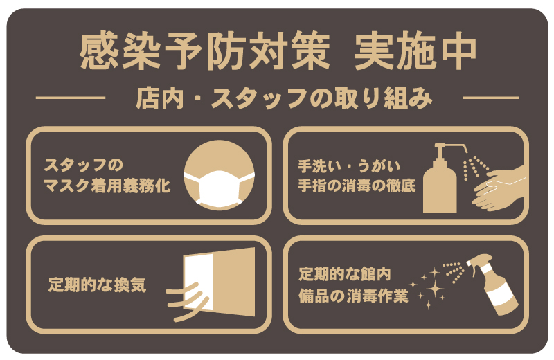 ・スタッフのマスク着用義務化 ・手洗い・うがい ・手指の消毒の徹底・定期的な換気 ・定期的な館内・備品の消毒作業