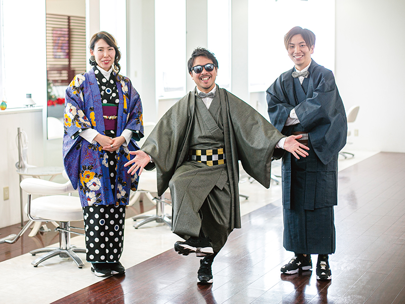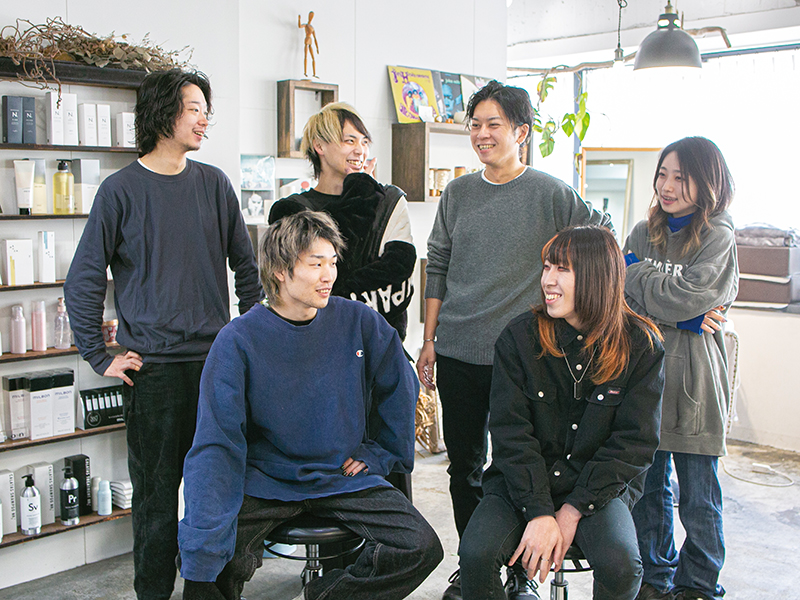(後列左から)スタイリストBABAさん、アシスタントSHOTOさん、オーナースタイリストISAOさん、スタイリストAKARIさん(前列左から)アシスタントKEITAさん、RIKUさん