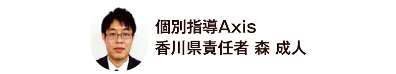 個別指導Axis(アクシス)は香川県で開校してはや22年目となり、この間、熱心な保護者の方々とお子さま方が数多く校舎へ足を運んでくださいました。こうして地域の皆様に支えられ、教育活動が実践できていることに感謝いたしますとともに、今後も、より一層ご満足いただけるように尽力し、成績アップ、志望校合格に貢献させていただきます。(個別指導Axis 香川県責任者 森 成人)