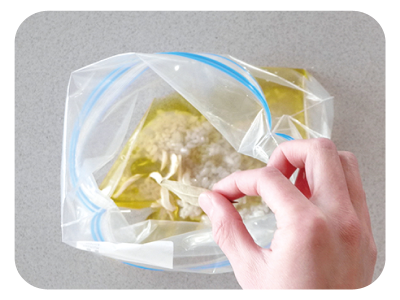 (2)マリネ液を保存袋に入れてよく混ぜ、(1)を入れて30分から一晩冷蔵庫で寝かせる。