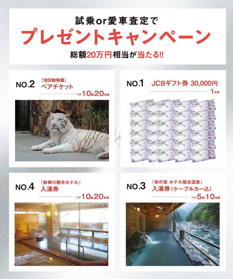 試乗or愛車査定でプレゼントキャンペーンキャンペーン総額20万円相当が当たる!!