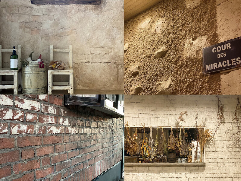 仕上げのエイジング塗装により、年月が経ったような古びた質感をリアルに再現でき、外国に来たような古い街並み、ノスタルジックな非日常の雰囲気を作り出しました。
