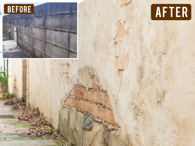奥様の趣味であるガーデニングが映えるようなワクワクするリフォームのご相談があり、既存のブロック塀を外壁塗装とモルタル造形の組み合わせることで、プロヴァンス風の遊び心をプラスしました。