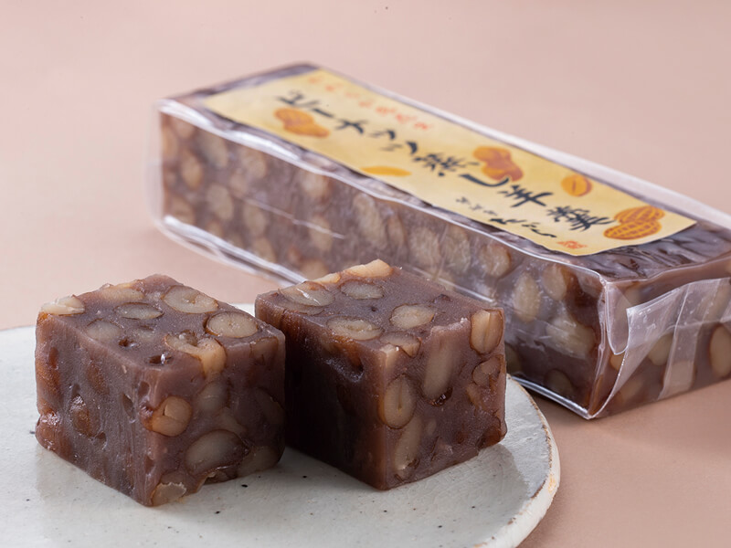 もっちりとした蒸し羊羹の中には、たっぷりとピーナッツが入っており、香ばしいピーナッツの風味と歯応えがお楽しみいただけます。ピーナッツ量と香りが違います。