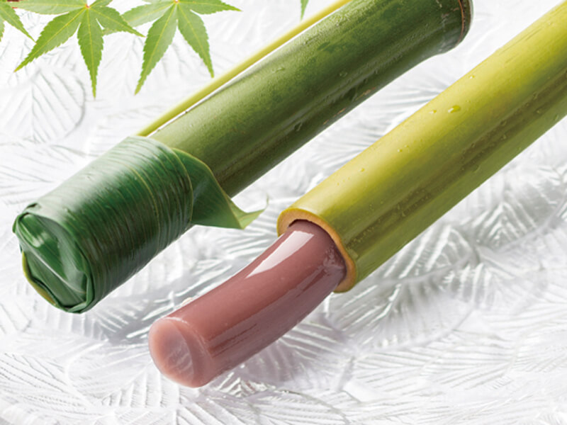 少し長めに(18cm)切った四国産の自然の青竹に、甘さ控えめの瑞々しい水ようかんを流し込みました。透き通った水ようかんの口どけとともに、ほのかに広がる青竹の香りもお楽しみください♪