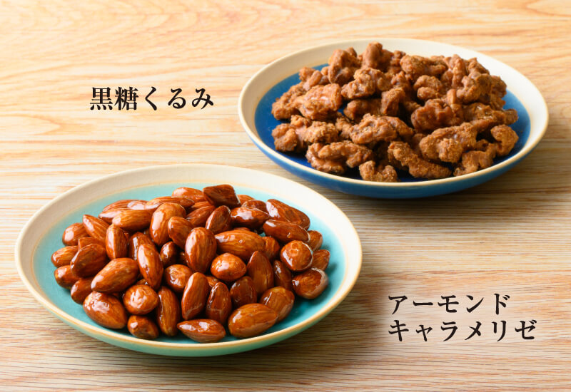 くるみを沖縄産黒糖とで煮詰めた「キャラメリゼ」の中に入れて、芳ばしくキャラメル色になるまでロースト。そのカリッとした食感はクセになる美味しさです。香川の希少糖入り。