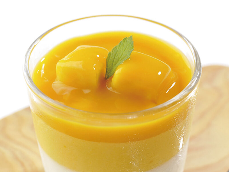 やわらかな杏仁プリンの中には「丹波大納言の鹿の子豆」を入れて、上には 濃厚でトロピカルなマンゴーのプリンを合わせて。さらに マンゴーの果肉ピューレを乗せた、贅沢な夏のデザート。