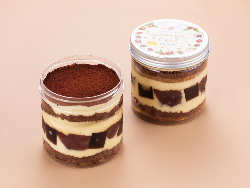 淹れたての珈琲を染み込ませた、どら焼きとチョコクランチに、フレッシュなマスカルポーネクリームと粒餡、更に珈琲ゼリーを入れて7層のティラミスに仕上げました。センターには、生クリームの入った「カフェオレ大福」を入れてます。仕上げにカカオパウダーを振りかけ珈琲とカカオの香る、少し大人の味わいに仕上げています。