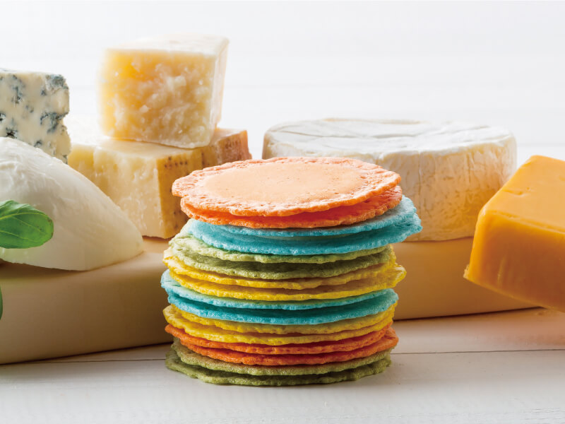 自宅でお洒落に美味しくカフェ気分。夜はBAR感覚でワインと一緒に。をコンセプトに4種類のチーズを挟んだ注目のお煎餅。第一印象は、色鮮やかで目を愉しませてくれる4つのカラーバリエーション。各チーズに合わせた色合いがテーブルを華やかに盛り上げてくれる。そして、「カマンベール&ブラックペッパー」「ブルーチーズ&ハニー」「モッツァレラ&バジル」「チェダー」と、チーズ好きにはたまらないセレクトに。これからの時期〈贈りたい、贈られたい〉アイテムとして、いつもとは違ったセンス溢れたギフトとして使ってみて。