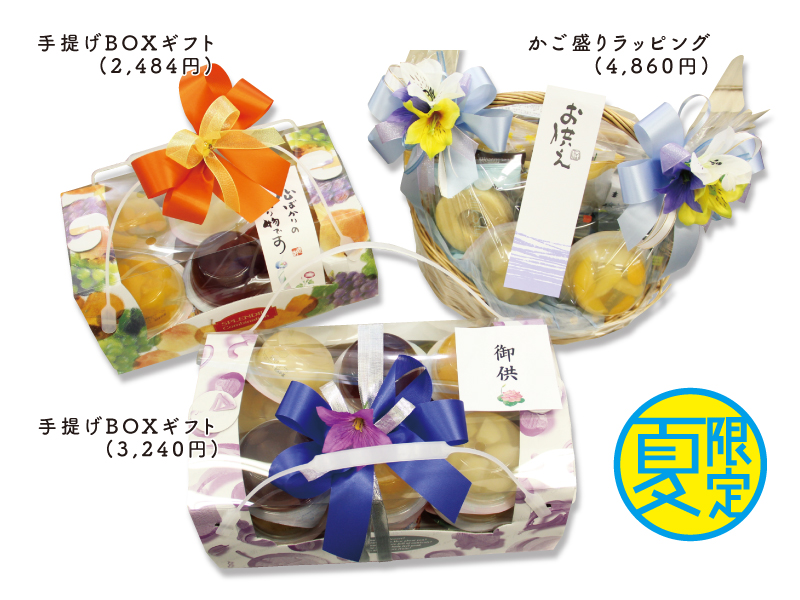 ・手提げBOXギフト(2,484円)、手提げBOXギフト(3,240円)、かご盛りラッピング(4,860円)