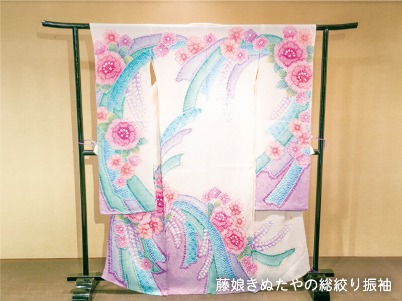 長い歴史の中で培ったプロの目利きで、クオリティの高い振袖を厳選。一点一点こだわり抜いて仕入れた絞りの最高峰「藤娘きぬたや」の振袖コレクション、は、図案からすべてがオリジナルで、親子3代にわたって着ていただく着物作りに定評があります。また、唯一無二の匠の技と、厳選した最高級の正絹を使った、加賀友禅・京友禅など、絢爛豪華な振袖にぜひ触れてみてください。すべてのお客様がお気に入りの一枚に出合えるよう、知識豊富なスタッフが真心を込めた接客で、対応させていただきます。