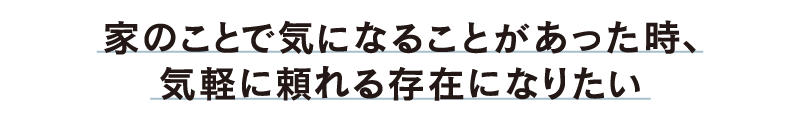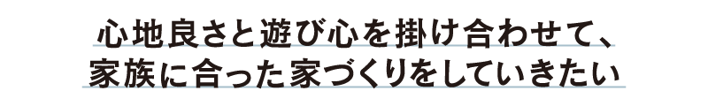 大量生産の商品化された住宅でも、建築家的な空間表現のための作品住宅でもない。そこで暮らす一人ひとりのお施主様が主役になる家と、それぞれの価値観やライフスタイルが映し出されたオンリーワンの空間。住むほどに愛着が深まっていく家づくりを大切に、1棟1棟丁寧につくり上げたい。そして、お引き渡し後もお互いの何気ない日常を共有し、笑い合えるようなステキな関係をずっと続けていきたい。そんな住まい手とつくり手の楽しい未来を実現したいと考えています。