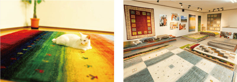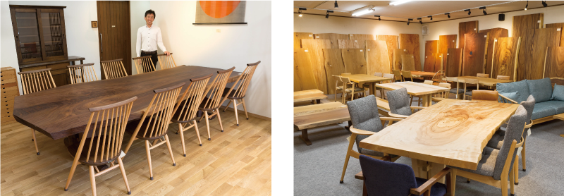 昨年8月にリニューアルしたショールームには、無垢材のテーブルやキャビネット、ソファなどここにしかないオンリーワンの家具や小物をはじめ、色彩豊かな手織り絨毯「ギャッベ」が優しく出迎えてくれます。2階のショールームには、ケアキ、ナラ、カバサクラ、タモなど貴重な国産材を中心に、欧米産のウオールナットなどの一枚板がずらり。見て触れて、樹木の持つ独自で優美な表情に対面できます。