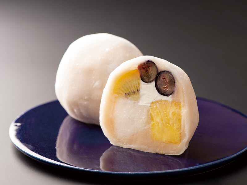 梨・パイナップル・キウイ・ブルーベリーの4種のフルーツにクリームチーズを入れ、ミックス大福に仕上げています。梨との相性は想像を超えます。