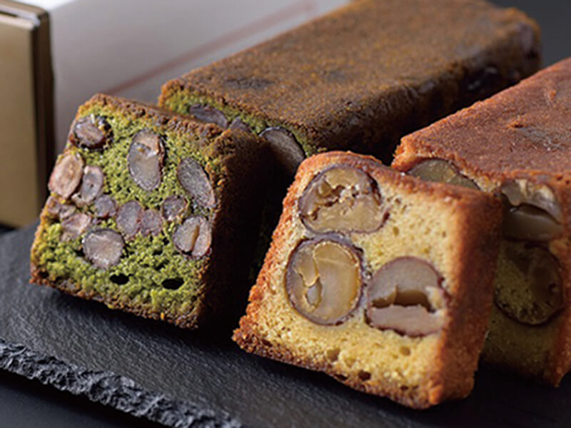 ブランデー風味が効いたしっとり生地に、渋皮栗がたっぷり入った「栗」。宇治抹茶をたっぷり練り込んだ生地に、大粒でやわらかい讃州大黒豆と丹波大納言小豆を散りばめた「濃茶」。