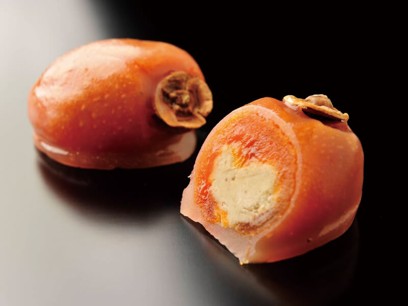 最高級 市田柿の中でも特上の赤柿に濃厚な栗きんとんを詰め、羊羹をかけました。芳醇な秋の味覚の二重奏はこの時期だけの贅沢な和菓子です。