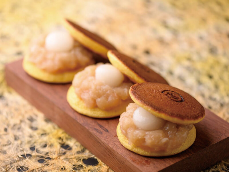 しっかりとした皮のどら焼きに、柔らかく炊いた白いんげん豆の旨味濃厚なつぶ餡と、もっちり白玉1粒を入れています。満月の月うさぎをイメージした秋限定のどら焼きをどうぞ。