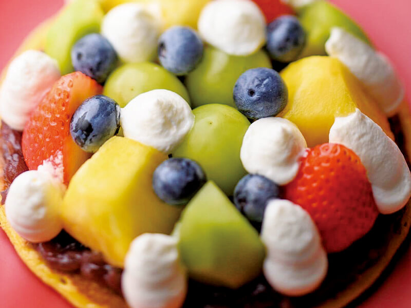 大きなどら焼きの上に敷いた柔らかな自慢のつぶ餡。その上に、パイナップル、シャインマスカット、夏瑞いちご、キウイ、ブルベリーの5種類のフルーツをたっぷりと敷き詰め、上から更にフレッシュな生クリームを合わせ、どら焼きでサンドしています。まるで宝石のようなフルーツの大どらは、切り分けてお楽しみ下さい。
