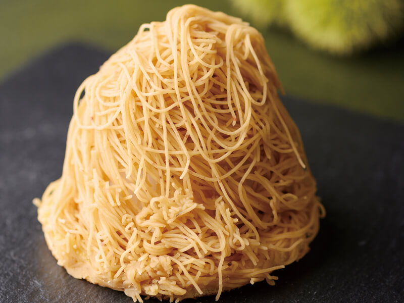 リニューアル商品。まわりを装った国産和栗の極細モンブランペーストの中には、自家製つぶ餡の生クリーム大福と、渋皮栗が丸ごと一粒入り、底にはどら焼きの皮を敷いています。たっぷりと掛かったモンブランのふんわり食感もアップした、この秋おすすめの大福です。