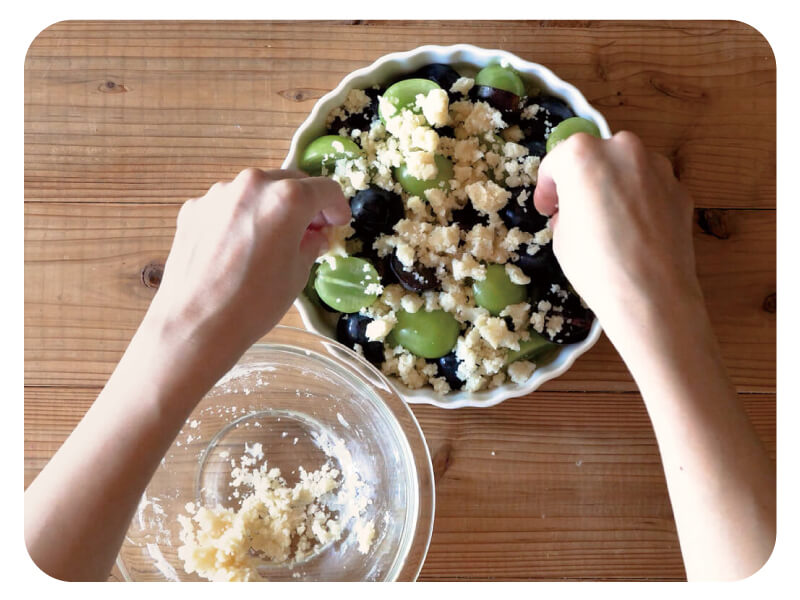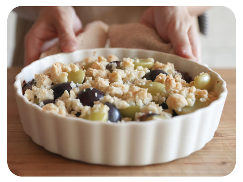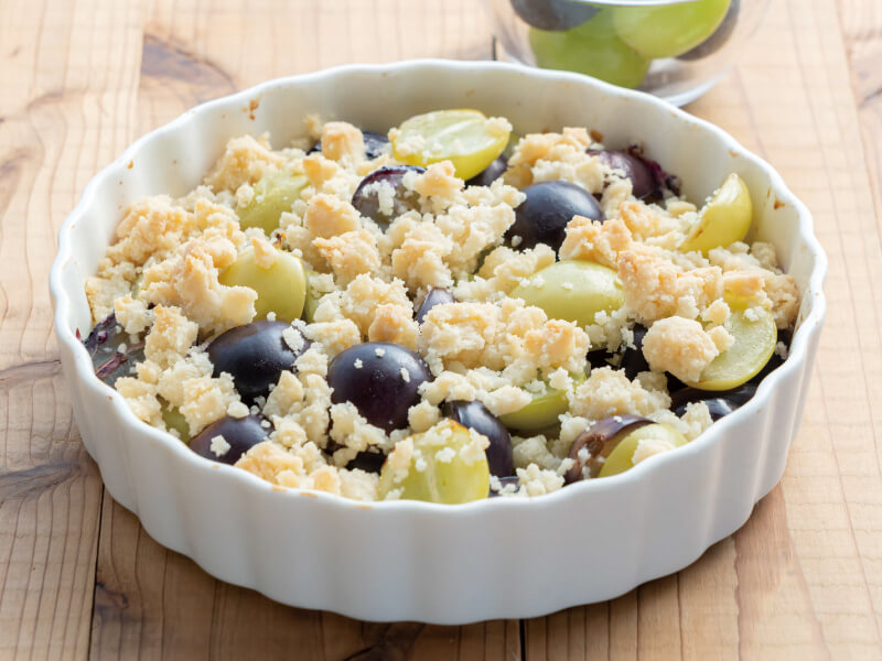 塩気のあるサクサク食感の生地と果物の甘さがマッチ!イギリス発祥の「クランブル」は、果物などにポロポロと崩れる細かい生地をトッピングして焼いた料理。今回のレシピは米粉と植物油などを使って、グルグル混ぜてのせるだけで簡単にできます。自宅でのおやつタイムや急な来客へのおもてなしにもおすすめ!テーブルの上がパッと華やかになる「ブドウのクランブル」をぜひ作ってみて。