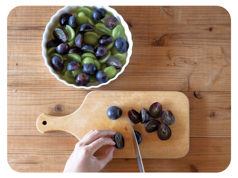 (1)シャインマスカットとピオーネは縦半分に切り、耐熱皿に並べる。