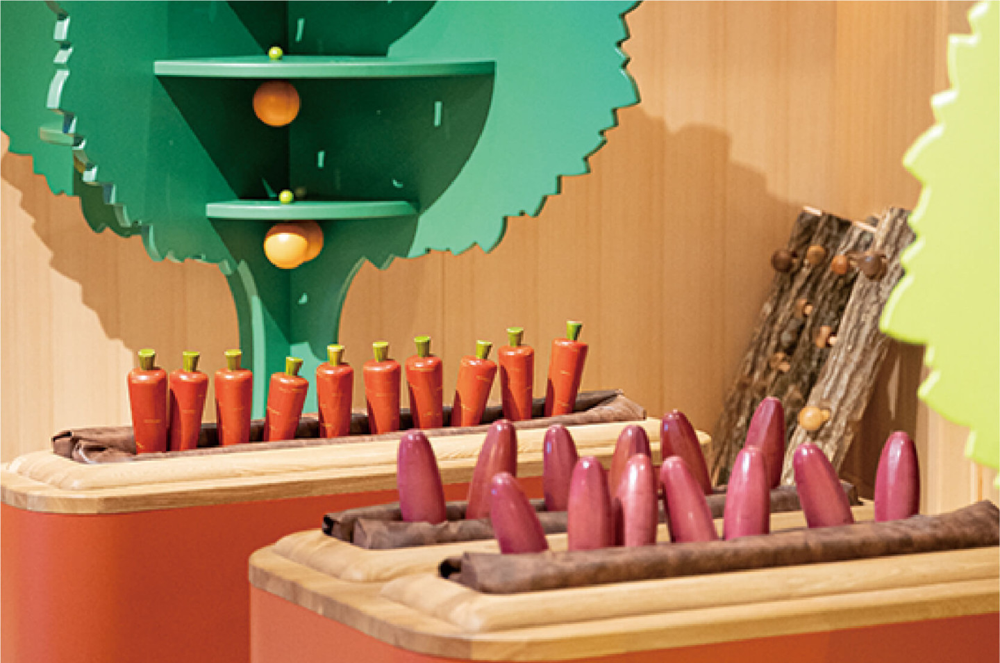 金時ニンジンやレモンなど、木でできた野菜やフルーツはどれも香川で育てられているものばかり!みんなで収穫してみよう!