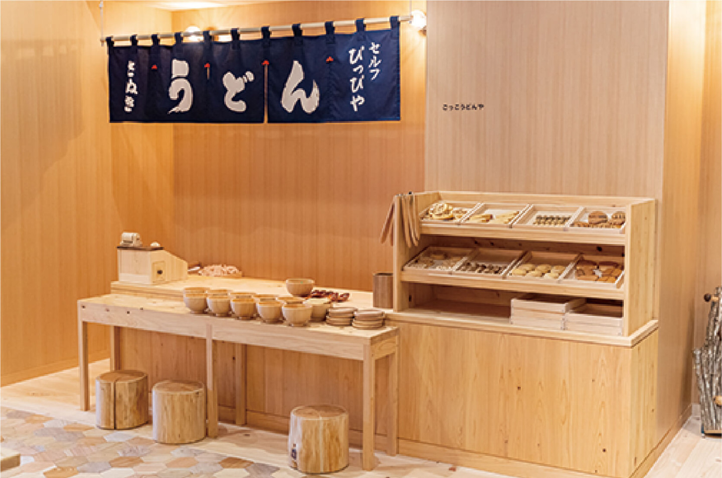 香川の子どもなら、ごっこ遊びもやっぱりうどん屋さん!?丁寧に作られた、セルフサービスの木製カウンターやトッピングの天ぷらは本物顔負け!