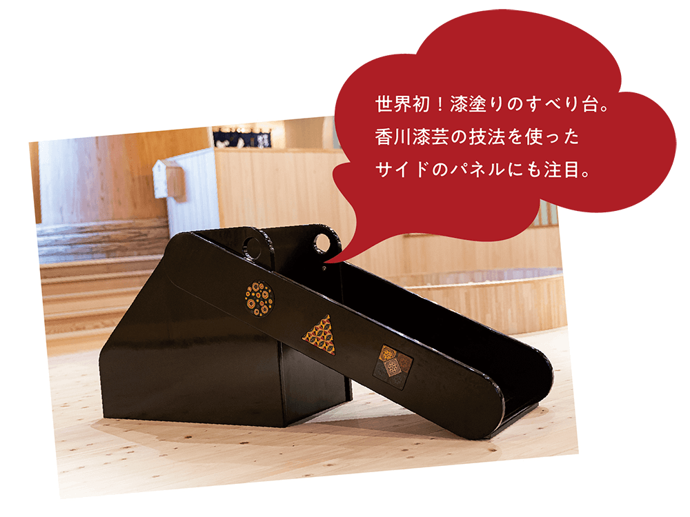 地域の子育て拠点であり、讃岐の伝統文化や豊かな自然の魅力を伝える情報発信拠点として、この春OPENしたばかりの注目スポット!まんのう町からやってきたシンボルツリーや17種の木が彩るエントランスを進むと、漆塗りのすべり台や盆栽をイメージした讃岐かがり手鞠の立体パズル、飯野山やため池をイメージしたオブジェなど、讃岐の風景や伝統文化を体感しながら楽しめる遊び場がいっぱい!遊びながら香川の魅力にたくさん触れられる、世界に1つだけの美術館へ出掛けよう!