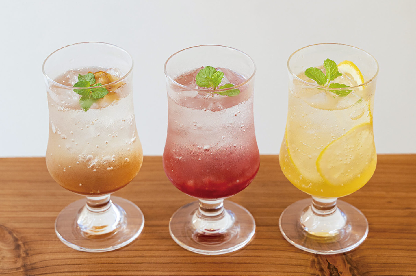 (左から)自家製ジンジャーソーダ、自家製いちごソーダ、自家製はちみつレモンソーダ(各550円)※終日注文可