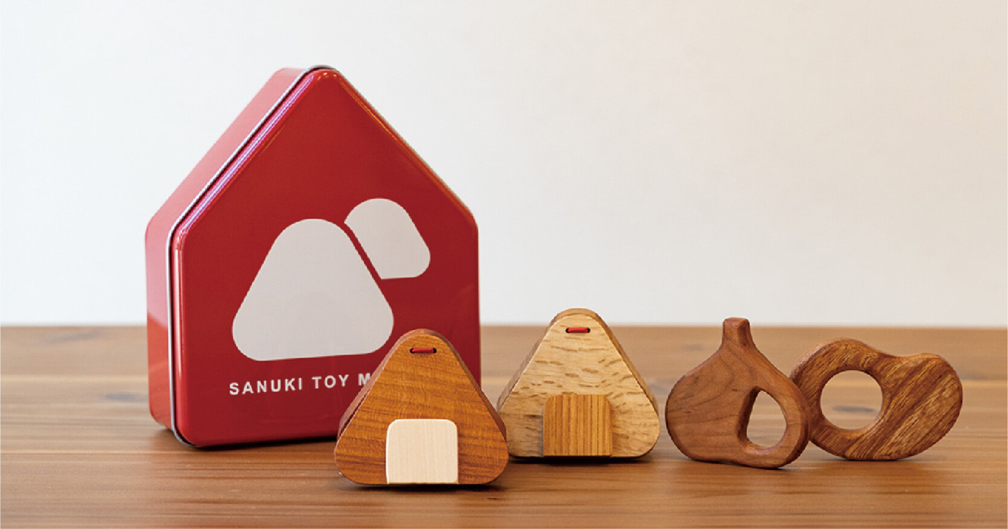 県産の木にまんのう町産のひまわりオイルを馴染ませて作った、おにぎり型のカスタネットや歯固め。オリジナル缶にはお好きな商品を詰め合わせることも可能。