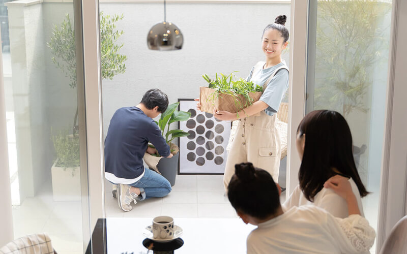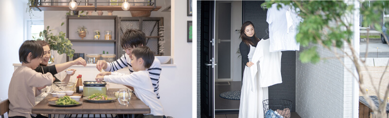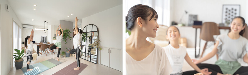 おうちヨガもできちゃう開放感のあるリビングやBBQや家庭菜園も楽しめるプライベートテラス。家族の暮らしに新しい“楽しい”が生まれる家をご提案。家族の思い出やそれぞれの好きなことを共有することで、家族への理解も深まります。