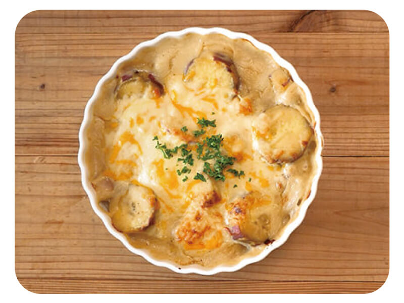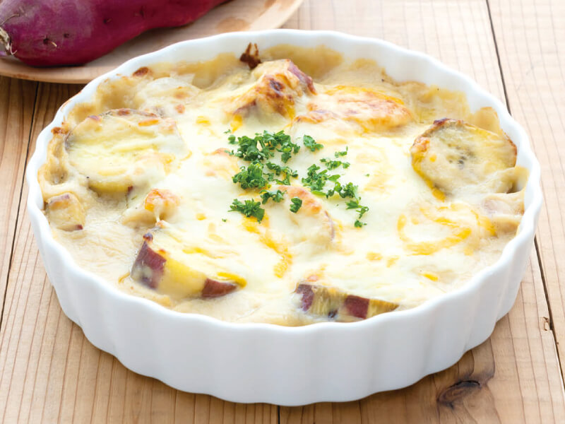 子どもから大人まで誰もが大好きなグラタン。今回ご紹介するレシピでは、かんしょの甘さと、白味噌・米粉・豆乳で簡単に作れるホワイトソースの塩気がベストマッチ!野菜もしっかり摂れるメインディッシュを、おうちでぜひ作ってみて。