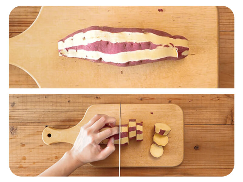 (1)かんしょはピーラーでしま目に皮をむき、1.5cm幅の輪切りにして水に5分さらす。タマネギはくし形に切り、レンコンは5mm幅のいちょう切りにし水に5分さらす。
