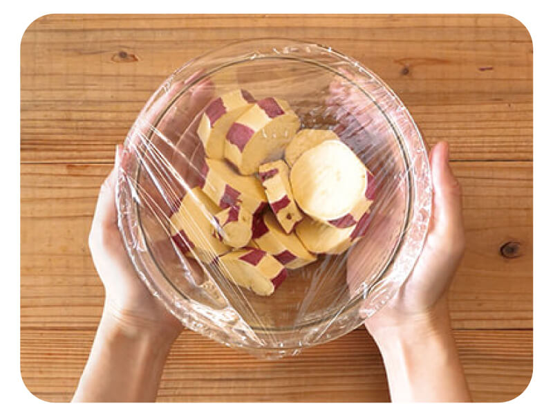 (2)かんしょを耐熱容器に入れてラップをし、電子レンジ500wで2分加熱する。