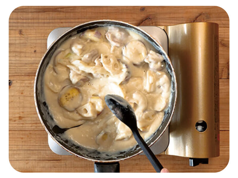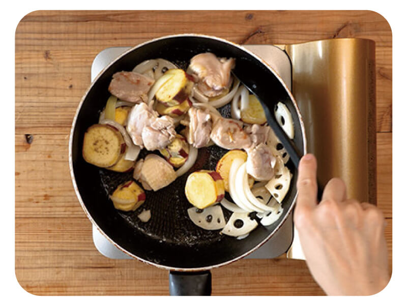 (3)フライパンを中火で熱し、バターを入れて溶けたら一口大の鶏もも肉・レンコン・タマネギ・かんしょを加え、塩・コショウをして炒める。