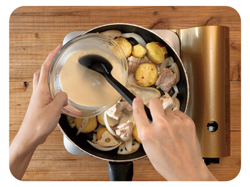 (4)タマネギが透き通ったら、よく混ぜたAを加えて一煮立ちさせる。