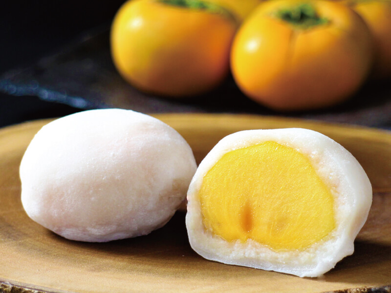 今年の柿大福は、香川県高瀬町の「刀根柿(とねがき)」で始まります。刀根柿の果肉は程よい硬さがあり、果汁が豊富でまろやかな甘味が楽しめます。柿と大福の相性は かなり良く、想像以上に美味しく仕上がっていますよ♪