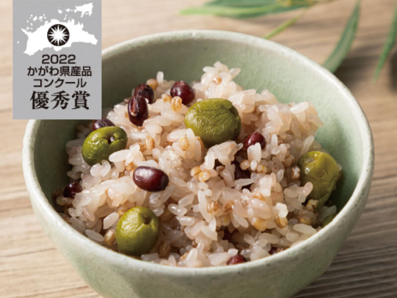 塩っぱさが新鮮な「小豆島産のオリーブの新漬け」を、「善通寺産のダイシモチ(もち麦)」を使ったおこわに入れました。「香川県産オリーブオイル」や「讃岐の藻塩」使用。