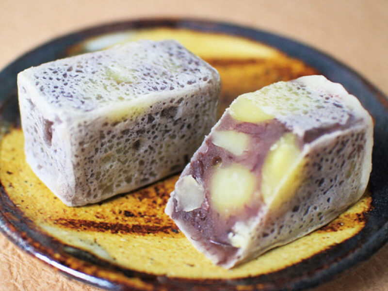 「栗きんつば」の栗は愛媛県の中山栗を使用しています。栗自体が優しい香りなので、味の濃い食材と合わせると感じにくくなりますが、「栗きんつば」に仕上げると優しい栗本来の香りが、小豆の味わいと一緒にお楽しみいただけます。「缶詰めの栗」とは一味違います!