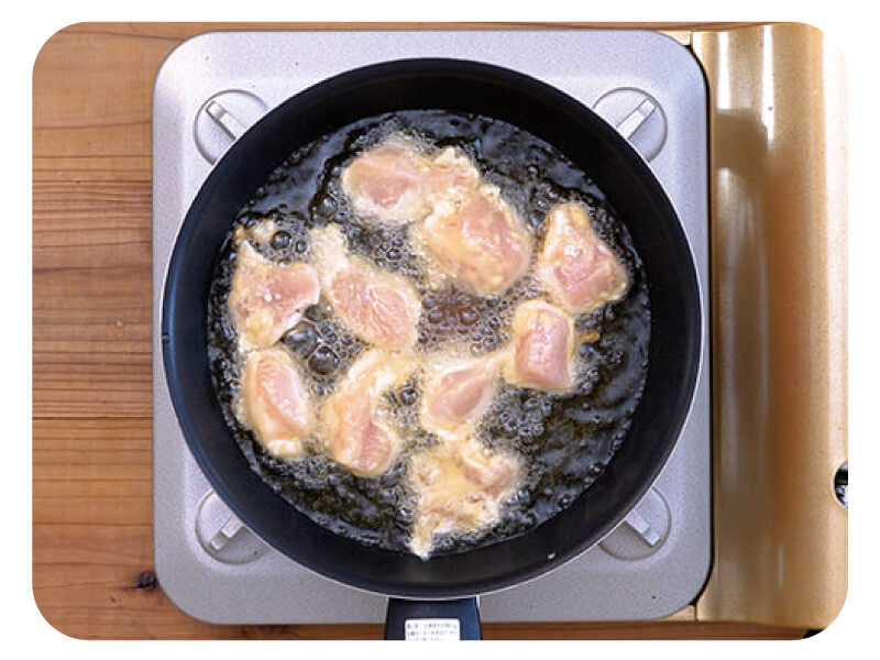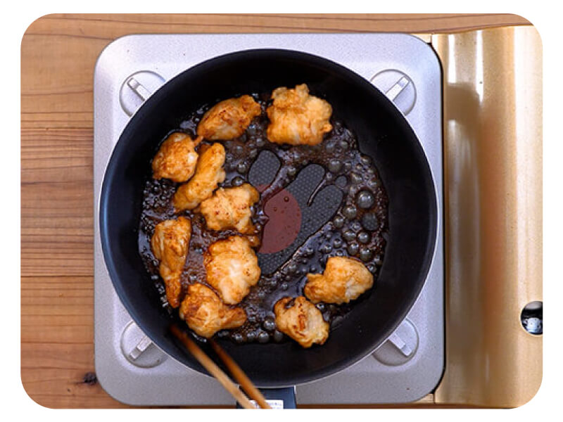 (4)フライパンにBを入れて煮立たせ、揚げた鶏むね肉に絡め、照りが出たら火を止める。