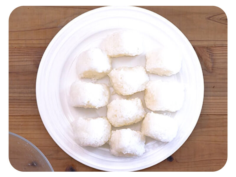 (3)炊き立てご飯を5等分にして、丸く握る。