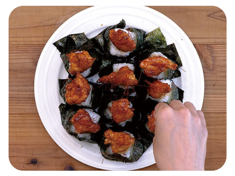 (6)縦3等分にした海苔を巻き、(4)のとり天をのせて完成!