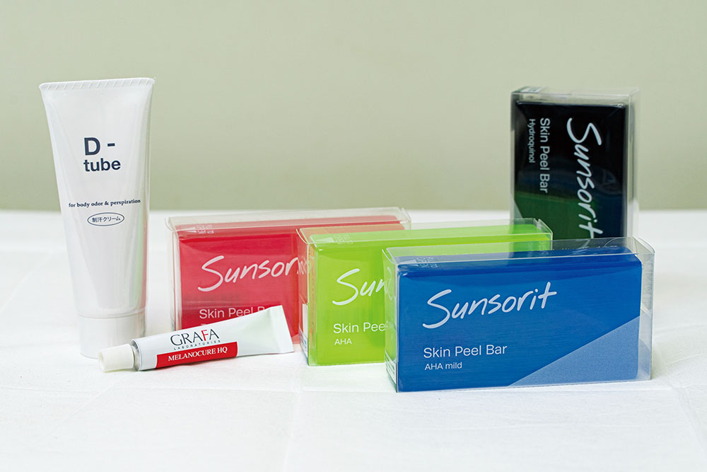 お肌の悩みに合わせた4タイプのピーリング石鹸としみ消しに効果のあるクリームや制汗剤等をとりそろえています。